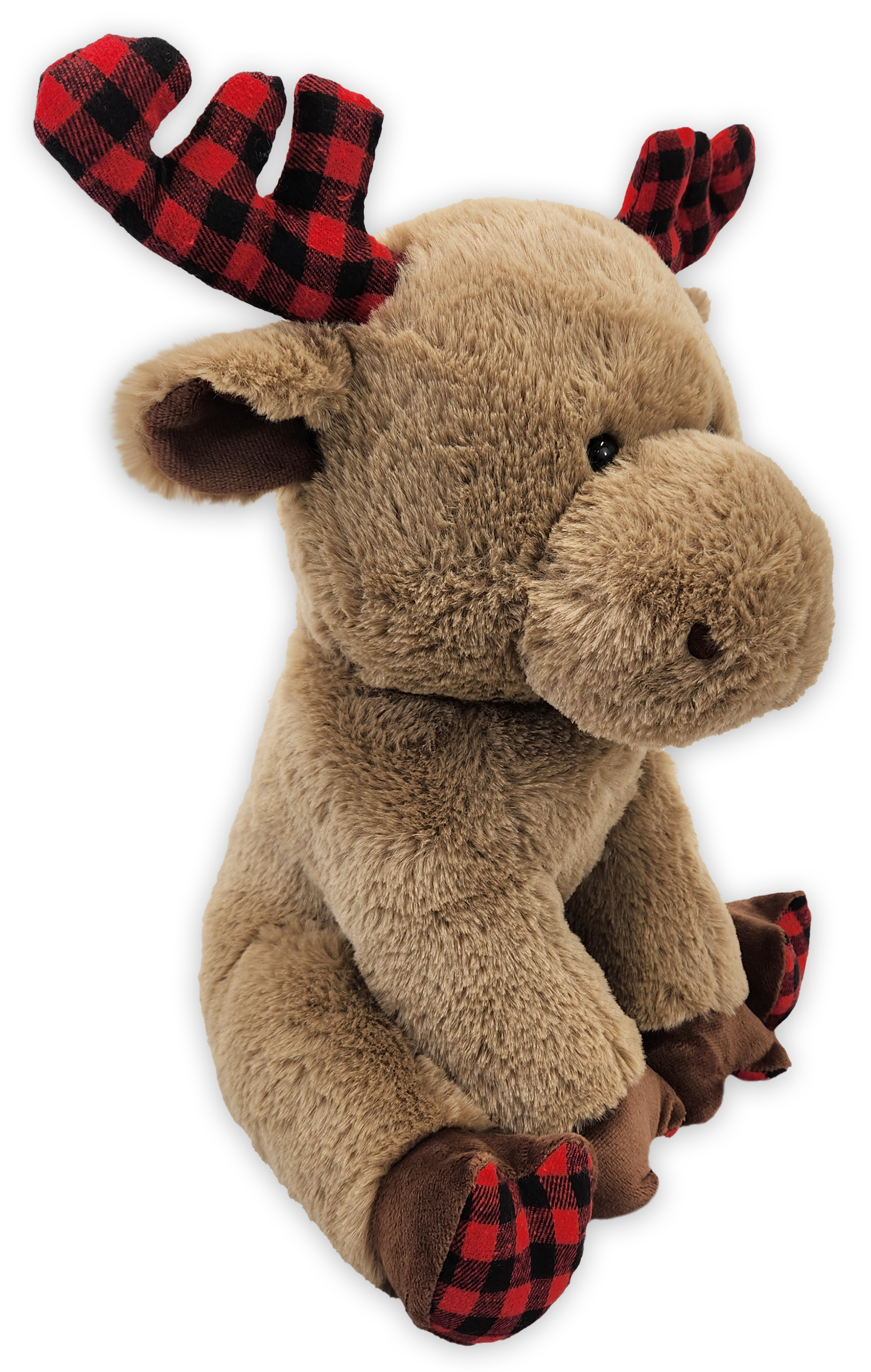 Extra Large Monty Moose - The heart of the forest ... meet Monty Moose. With his flannel buffalo printed feet and antlers, to his cozy cocoa plushy body, he is the ultimate fireside cozy companion for all ages.
